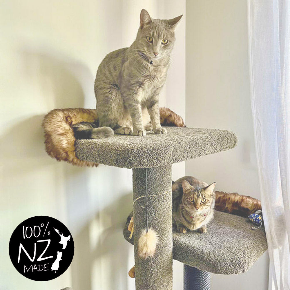 Our upright poles, the backbone of our Cat Trees, are built from solid 100mm thick New Zealand pine. The carpeting on these poles is firmly glued and stapled, allowing for longevity and easy recovery even after your cat has extensively used the surface. This feature ensures that our products are both sustainable and extendable over time.
