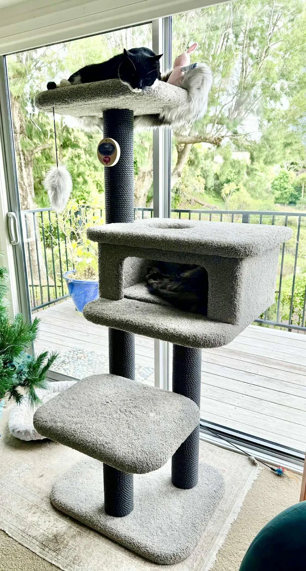 Our upright poles, the backbone of our Cat Trees, are built from solid 100mm thick New Zealand pine. The carpeting on these poles is firmly glued and stapled, allowing for longevity and easy recovery even after your cat has extensively used the surface. This feature ensures that our products are both sustainable and extendable over time.