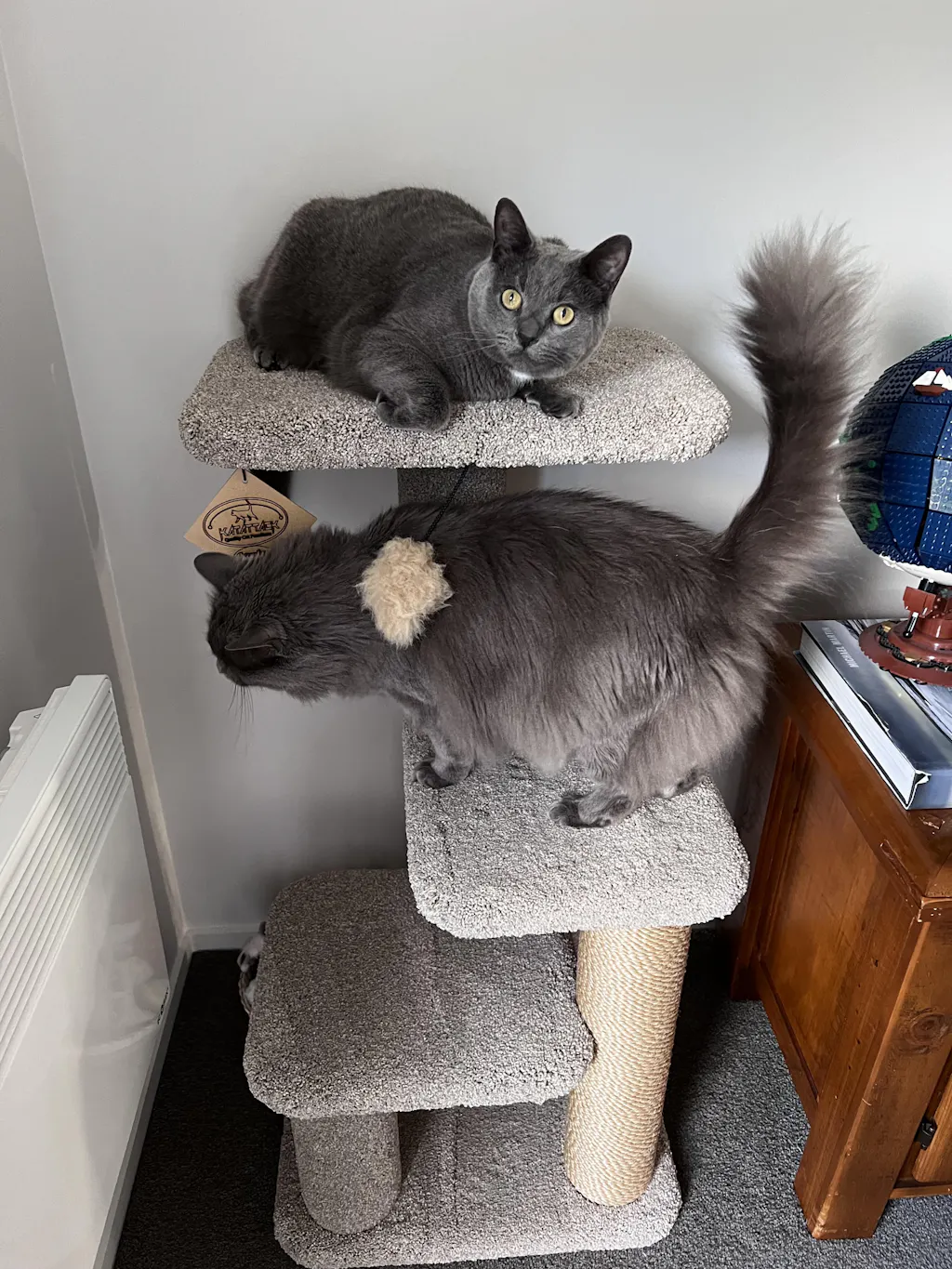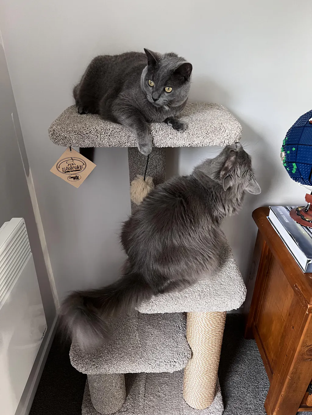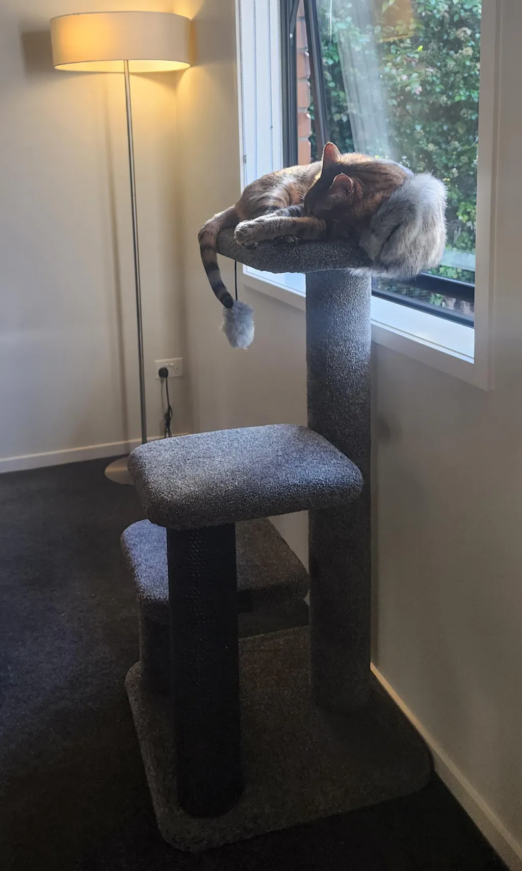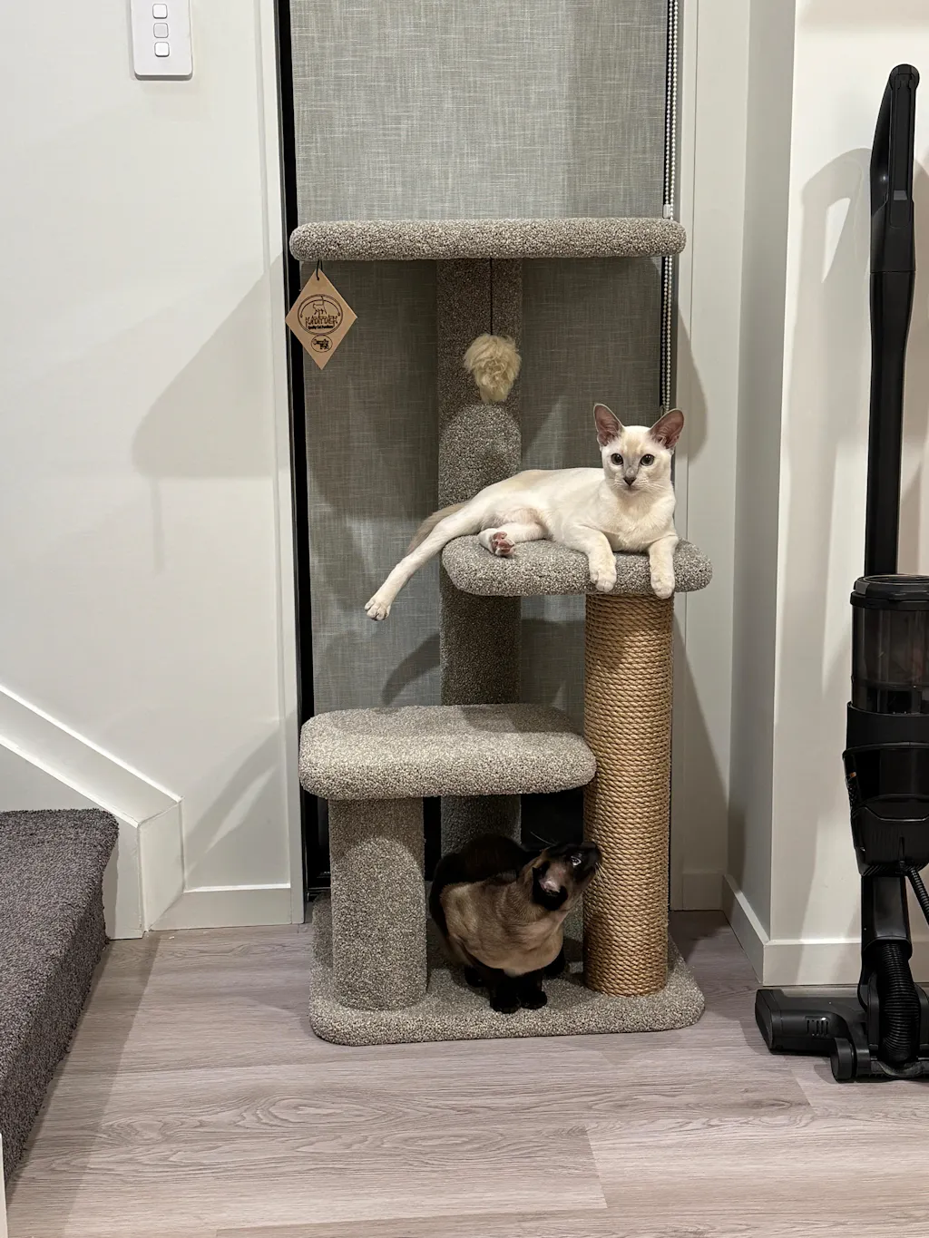 Our upright poles, the backbone of our Cat Trees, are built from solid 100mm thick New Zealand pine. The carpeting on these poles is firmly glued and stapled, allowing for longevity and easy recovery even after your cat has extensively used the surface. This feature ensures that our products are both sustainable and extendable over time.