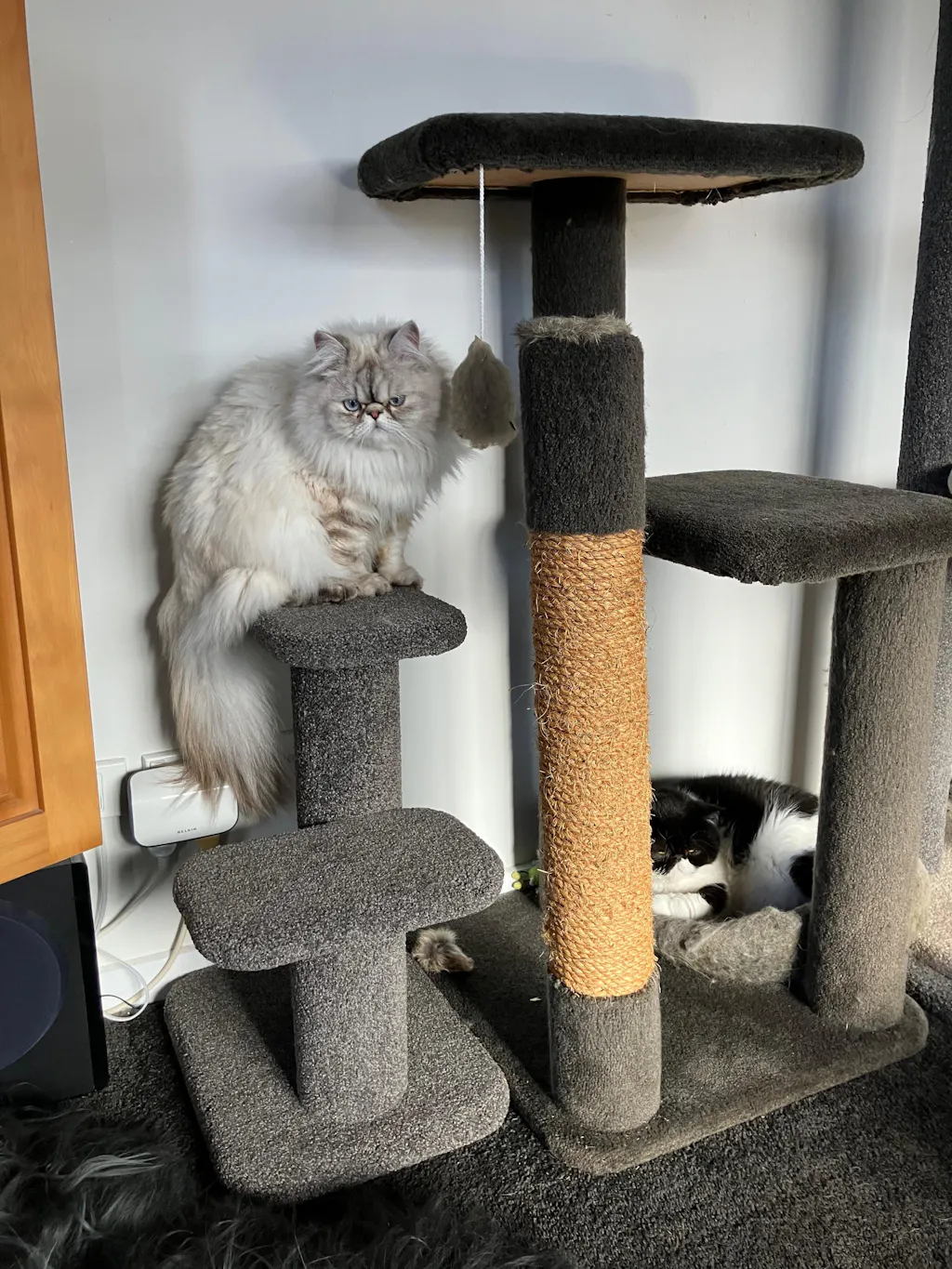 Our upright poles, the backbone of our Cat Trees, are built from solid 100mm thick New Zealand pine. The carpeting on these poles is firmly glued and stapled, allowing for longevity and easy recovery even after your cat has extensively used the surface. This feature ensures that our products are both sustainable and extendable over time.